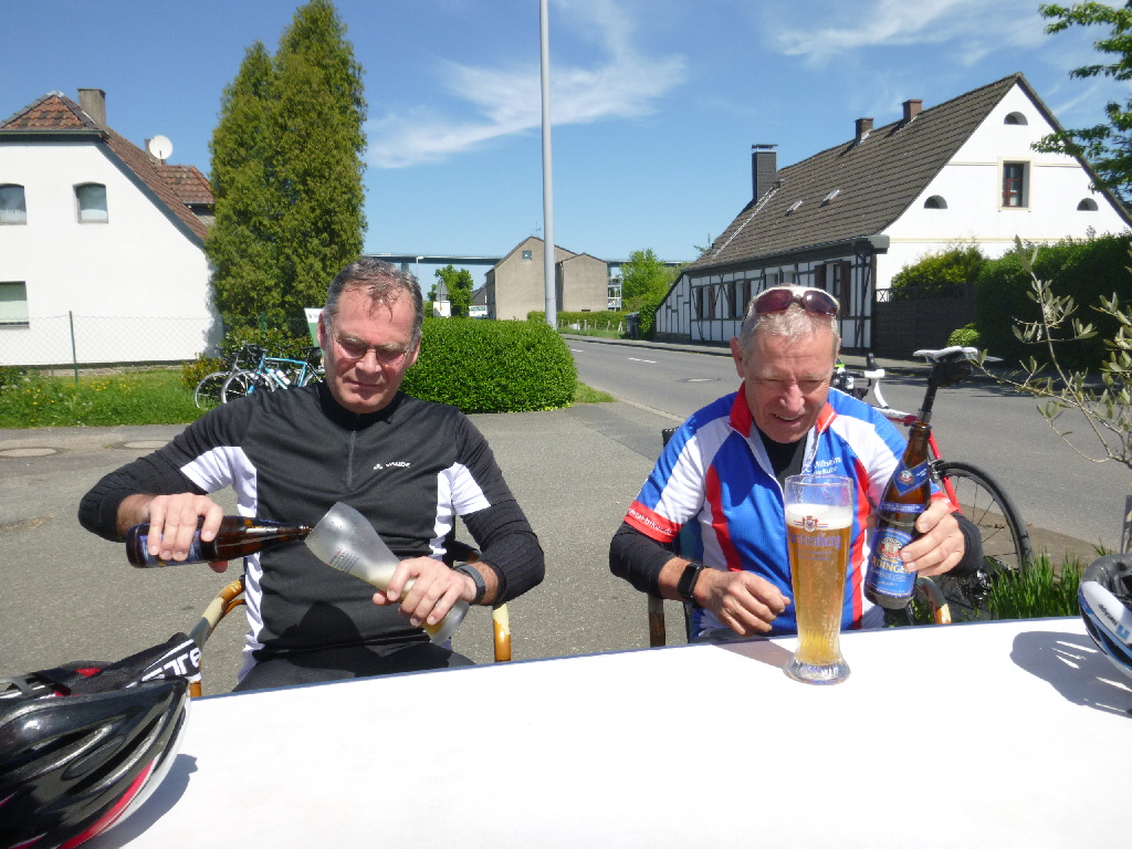 Ein paar Höhenmeter sind gut für den Formtest. Thomas hatte das Extra-Super-Bergritzel aufgelegt und wir trafen uns an Friedels 8:45 Uhr Treff am Gashaus. Der Andrang war erstaunlich groß, 9 halbwegs bergtaugliche Teilnehmer hatten sich dem vorausgesagten Bilderbuchwetter nicht entziehen können, sogar Michael O. schloss sich der Gruppe an. Über Werden, Baldeney-See bis Nierenhof blieb die Gruppe zusammen, dann teilten wir uns, Thomas, Rene und ich wählten die ausgeschilderte Hattinger Strecke übers Wodantal und Elfringhausen und hatten sicher die schöneren Ansichten und den geringeren Verkehr. Am Startort traf man sich wieder. Die warme Sonne lud zum Verweilen ein und zurück ging es dann wieder in Kleingruppen. Thomas testete die heutige Fitness und schleppte uns in ansprechendem Tempo von Werden nach Kettwig und er gewann sogar den kleinen Hügelsprint bis zum Abzweig an der Charlottenhofstr. – also alles in guter Verfassung. Am Mintarder Büdchen trafen wir wieder auf Otti und pausierten mit Sonne und Weizen alkoholfrei. Angesichts des tollen Wetters also eine wunderbare Samstagmorgenaktivität. km