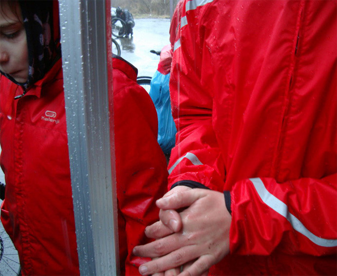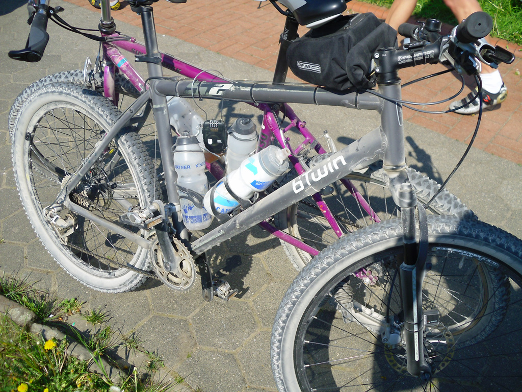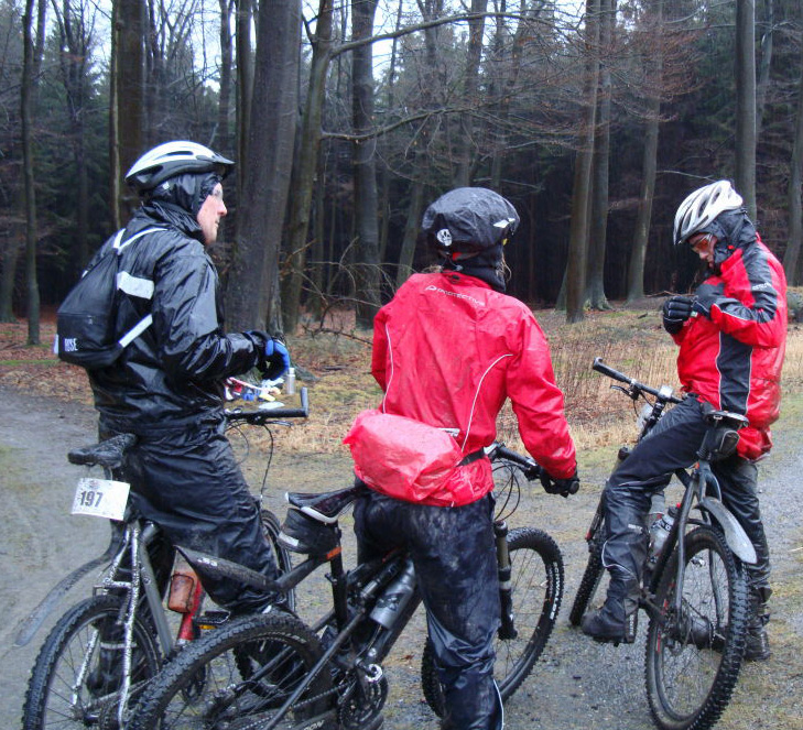 Wir waren dann doch am Start, um die Wetterverhältnisse am Möhnesee persönlich zu überprüfen. Wir mussten feststellen, daß das Wetter schlechter war als zu Hause. Schon mal da, fuhren wir natürlich auch eine Runde. Es war eine tolle Strecke, die uns da ausgeschildert worden war. An der ersten Kontrolle gab es kleine Kuchen, Suppe, Brote und fließend Wasser um sich die Hände zu waschen. Auf dem Weg zur 2. Kontrolle hatte dann ein besonders lustiger und netter Mensch die Markierungen umgehangen oder auch entfernt, um die Spannung im Teilnehmerfeld hoch zu halten. Auf diesen unsicheren Wegen trafen wir dann Klaus T. und fuhren nun zu dritt durch den Tann. Eine berauschende Abfahrt auf einer breiten Schotterpiste, belohnte uns für die Mühen bergan. Nach einunddreißig Kilometern stand das Wasser nicht nur in den Schuhen ! Das Ende der Tour beschlossen wir mit einer Bockwurst im Magen und Schlamm im Auto. (Text und Fotos: TT)