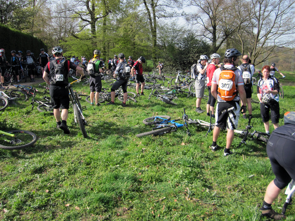 Thomas hatte sich für die Strasse entschieden und sonnte sich auf der Sternfahrerstrecke, wir nahmen die CTF unter die Räder und freuten uns über eine tolle Strecke, die mit viel Phantasie und Aufwand ausgeschildert war. Auch die RTC-Vorstandsetage hatte sich für die CTF entschieden und begegnete uns bisweilen. Das ungewöhnlich schöne Wetter hatte hunderte Radler zur Anreise nach Grefrath veranlasst und der Ansturm am Start führte die Veranstalter an ihre Grenzen. Selbst für die Räder gab es Parkprobleme. Aber nach Erhalt der Startunterlagen entspannte es sich auf der Strecke schnell und wir konnten Natur und Niederrheintrails geniessen. Beeindruckend, die vielen Hügelchen, die in der flachen Landschaft im Weg standen und überwunden werden mussten. 630 Hm kamen auf der 57 km Strecke zusammen und trotz des moderaten Tempos war Arbeit angesagt.