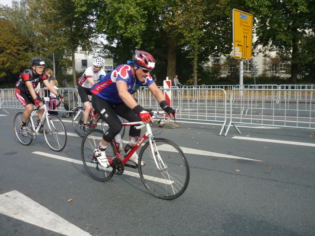 6, unterwegs sammelten wir noch ein paar Vor-und Nachzügler ein und rückwärts blieben dann 5, ein paar eilige voraus und uns gelang es ein Tempo anzuschlagen, dem auch Lothar gut folgen konnte -das Abschlussbier an der Duisburger Rheinbrücke war kultureller Schlusspunkt.