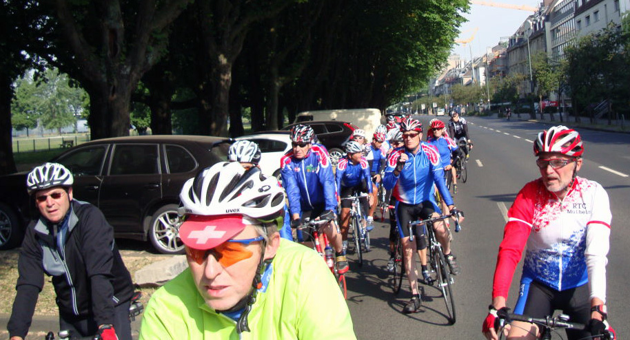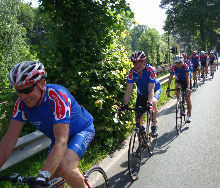 Ein grosses Peloton setzte sich gen Schwelm am Morgen in Bewegung. Bunte Trikotvielfalt herrschte vor, denn Sturmvögel und Kollegen vom Team Ruhrtal hatten sich angeschlossen. Baldeney-See, Nierenhof, Wodantal waren die Stationen nach Schwelm, die sich zum Höhenmeter sammeln anboten. In Schwelm wurde die Mülheimer Gruppe freundlich und lautstark begrüsst.