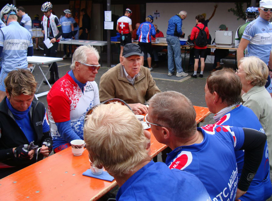 | befahrbar. Zügig ging es voran. Um ein Haar hätten wir ein Purzelbaum schlagendes Enten-Junges auf dem Weg zum See überfahren. Glück gehabt – für alle Beteiligten! Nach und nach ging es bergan und die schnelleren Fahrer haben ein wenig warten müssen.Ganz unerwartet trafen wir noch auf Lothar und Manfred, die sich etwas eher auf den Weg gemacht hatten. Der Weg ist schon eine kleine Herausforderung, der ich mich gerne stelle. Ein paar Urlaubsgefühle stellen sich bei diesem schönen Panorama ein, sofern es Gelegenheit zum Genießen der Landschaft gibt, aber das wird immer besser. Kurz vor dem Ziel wurde gesammelt und „Sir Henry“ und sein Gefolge fuhren grüßend an uns vorbei. Bei der Anmeldung gab es etliche Klamotten ‚sponsored by DEKRA’- Mütze, Jojo, Rücklicht, Schlüsselanhänger. Viele selbst gebackene Torten und Küchlein vom Verein (ist ja auch nicht mehr selbstverständlich) waren günstig und käuflich zu erwerben. Die Veranstalter waren ebenfalls zufrieden mit ca. 350 Anmeldungen. |
