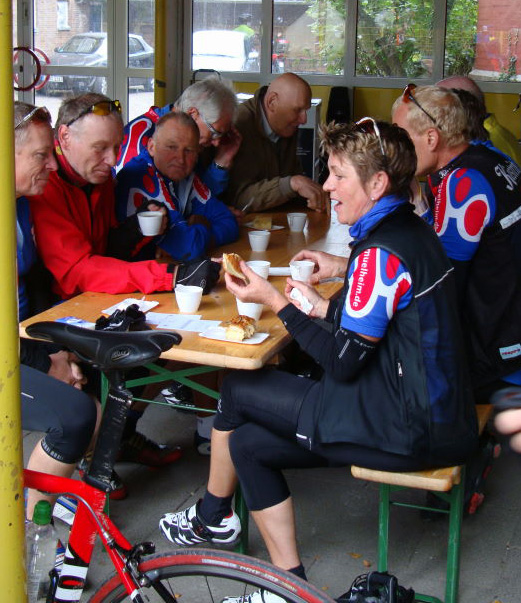 Nach Uedem ist es schwer sich zu verfahren - mehr oder weniger Nordnordwest und meist geradeaus, also war Zeit für den Plausch bei moderatem G1 Tempo. Sein Comeback auf dem Rad feierte Bernd K. nach dem Unfall und schlug sich prima. Die Uedemer "Kantine" bot wie üblich leckeren Kuchen, lediglich der Kaffee wirkte arg gestreckt, aber blutdruckfreundlich.