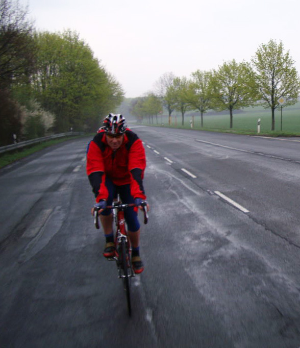 Ein kleines Frühstückchen, die Trinkflaschen gefüllt. Dann die Morgentoilette, in das hautenge Lycra gezwängt und schlagartig wird mir klar, daß das mit der Diät im Winter nicht so hingehauen hat. Man kommt sich auf einmal vor wie eine Presswurst, aber egal, wenn man Rad fahren will, müssen die Anderen halt leiden. Es geht nichts über ein gewisses Maß an Ignoranz, sonst hätte man ja gar keinen Spaß mehr am Leben.