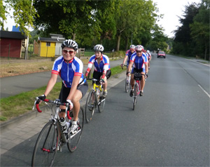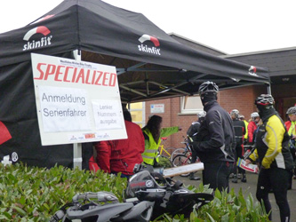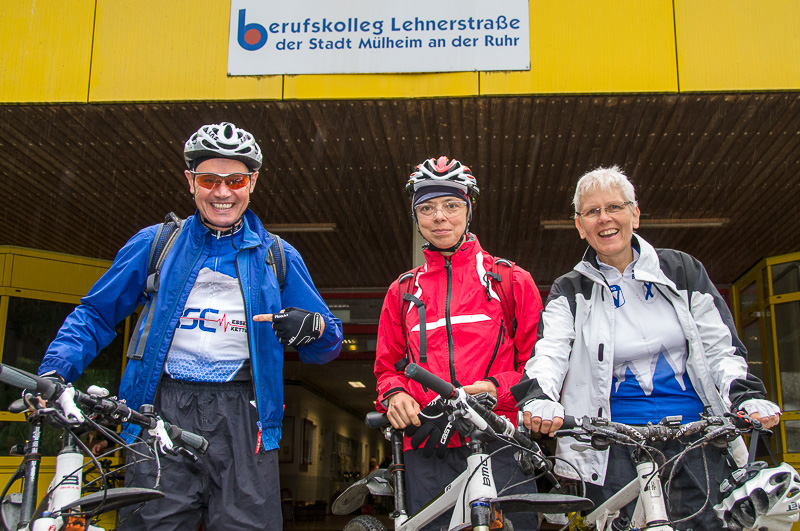 Wir vier fuhren total "cool" mit dem Rennrad nach Essen Vogelheim. Kurz vor Start und Ziel trafen wir Heinz. Er hatte schon die ersten Meter der 45er Runde hinter sich, fuhr aber noch mal mit uns zur Anmeldung, so dass wir gemeinsam auf die Runde gehen konnten.