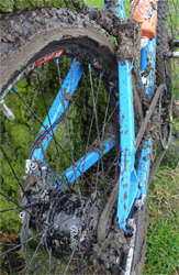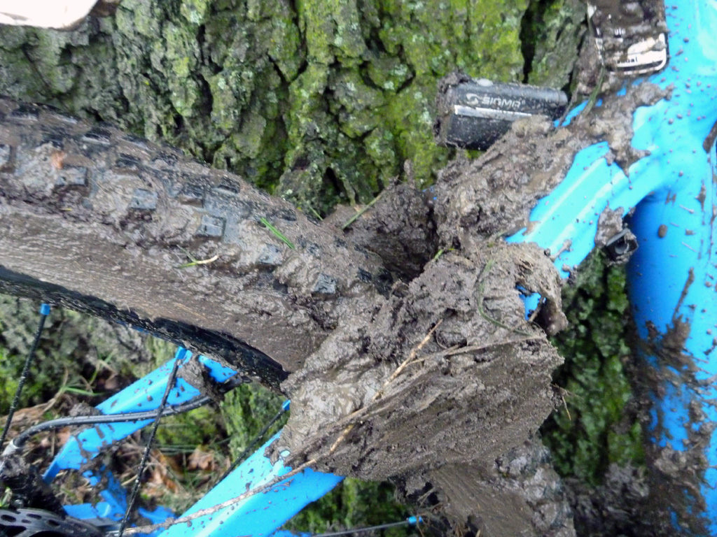 Geläuf, bringt aber nicht vorwärts. ZurWahl stehen zwei tiefe braunglitschige Spuren, rechts und links des Weges, in der Mitte ist eine Grasnabe zu ahnen, die aber genauso tief ist, wie die Spur rechts oder links, nur die Räder sind besser zu erkennen. Die Mocke zieht sich klebstoffgleich am Rad nach oben und wird an Rahmen und Gabel abgestreift, sammelt sich an allen Ablagen, die ein |