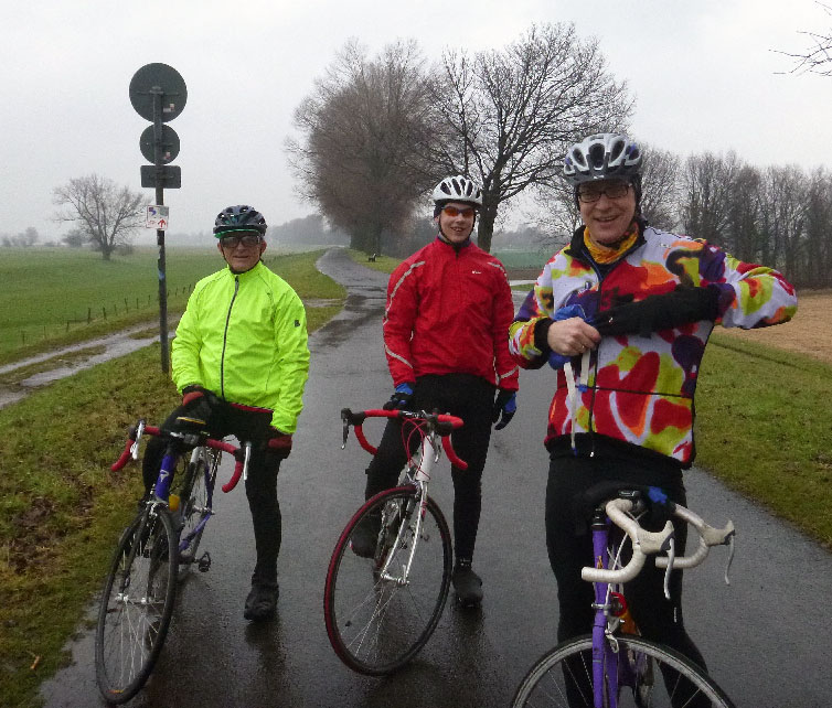 Die CTF-Gruppe überholte uns und hupte aufmunternd. Gegenwind und mal mehr, mal weniger Regen begleitete uns auf dem Weg. Heute war der erste RTF Termin in unserem Tourenplan und Jörg´s erste RTF mit dem RTC. Das Wetter konnte nicht überzeuen, aber der Rest war schon richtig super. Zum Schluß hatten wir rund 120 km auf dem Tacho und Wasser nicht nur in den Schuhen.