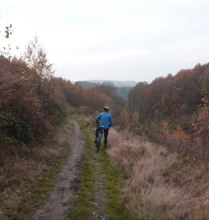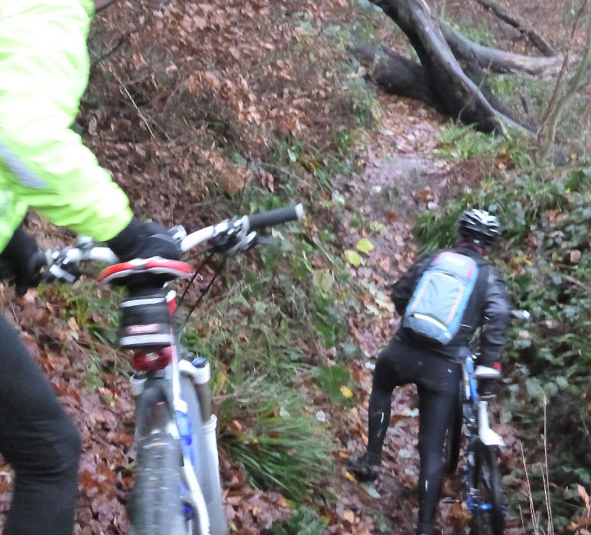 Der Anstieg zur DJH in Werden bietet lockere 12 % und wir waren froh dafür Asphalt unter den Rädern zu haben. Oben war die Aussicht bilderbuchmäßig, der Trail führte uns zurück zum Kutschenweg, dem wir natürlich bergauf folgten und oben rechts in den Wald eintauchten. Den Abstieg meisterten wir angesichts des halbwegs verblockten Trails, der mit Laub zugeschüttet war, mittelmäßig, aber unfallfrei.
