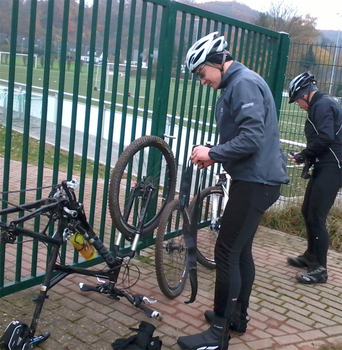 Nach dem Schnack mit Jörg T. zogen wir weiter und pausierten in Kettwig, weil TT das Ventil am Hinterrad durchgesessen hatte. |