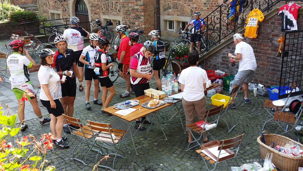 Statt Sternfahrt wurde es diesmal „Vor-Ort-Start“. Der Andrang war gewohnt groß, aber unsere Anmeldung ging flott. Wir waren pünktlich auf der Strecke, Brigitte zog ihre Kreise mit Susanne auf der kleinen, wir rollten recht flott auf der langen Runde. Allerdings gab es viele, die noch deutlich flotter unterwegs waren, hin und wieder gab es deshalb Staus an den wenigen kniffligeren Passagen. Auf der 2. Kontrolle schloss Roland zu uns auf. Er war spät dran und hatte tüchtig Gas gegeben um aufzuholen. Zu Dritt rollten wir kanalauf und -ab Richtung Ziel. Roland hatte auch Friedhelm unterwegs gesichtet, womit wohl das RTC-Kontingent erschöpft war. Immerhin begleitete uns nach ein paar morgendlichen Regentropfen die Sonne – gut für die Laune und am Ziel wurde dieser Effekt noch mit Frankfurter Kranz verstärkt.
