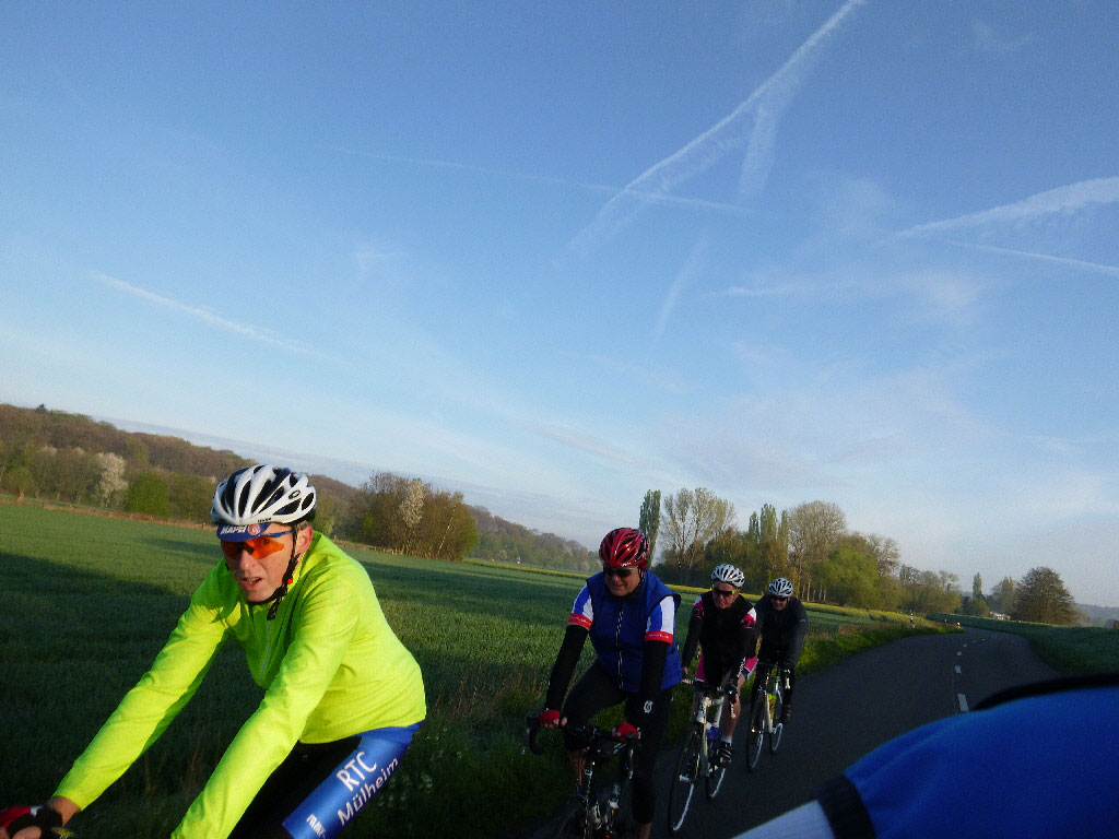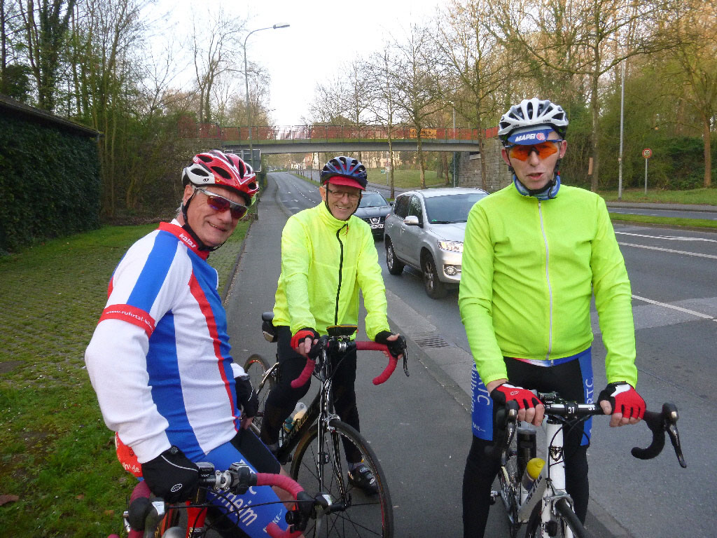 Die Saisoneröffnung war als „Schwerpunktfahrt“ ausgewiesen und die Schwerpunktfahrten werden jeweils eigene Konzepte haben. Zur Saisoneröffnung sah das Konzept so aus: Zum Start bilden wir 2 Gruppen, eine (die flottere) startete ab Mülheim mit rund 110 Sternfahrtkilometern, die 2. Gruppe traf sich an der Rheinbrücke der A44 mit einem Pensum von rund 75 km.