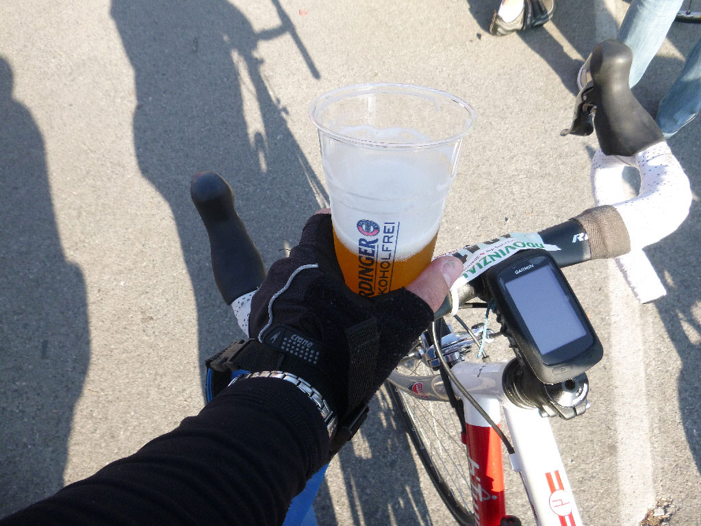 Aber mit den 799 anderen Teilnehmern fühlt man sich nicht einsam und auf der 70 km Strecke schaffte ich in diesem Jahr erstmals unterwegs 2 Flaschen zu leeren. Die lange Hose, Langarmtrikot und das Craft-Unterhemd mit langem Arm boten Anlass zum Schwitzen. Immerhin verdunstete alles schnell und stellte dem teuren Aufwand ein gutes Zeugnis aus: Trotz Winterkluft und Sonnenschein war das Empfinden kuschelig, aber nicht unangenehm.