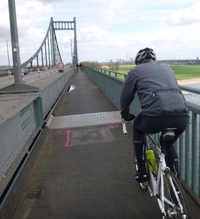 Durch kleine Streckenvariationen und kurzzeitiger Gruppentrennung kamen auch die beiden Rennradfahrer durch Umgehung von naturnahen Wirtschaftswegen gut zum Radladen in Unterrath. Hinter dem Aquazoo kamen dann alle in der Höhe des Messegeländes auf wohlbekanntes Terrain am Rheinuferweg.