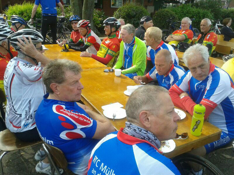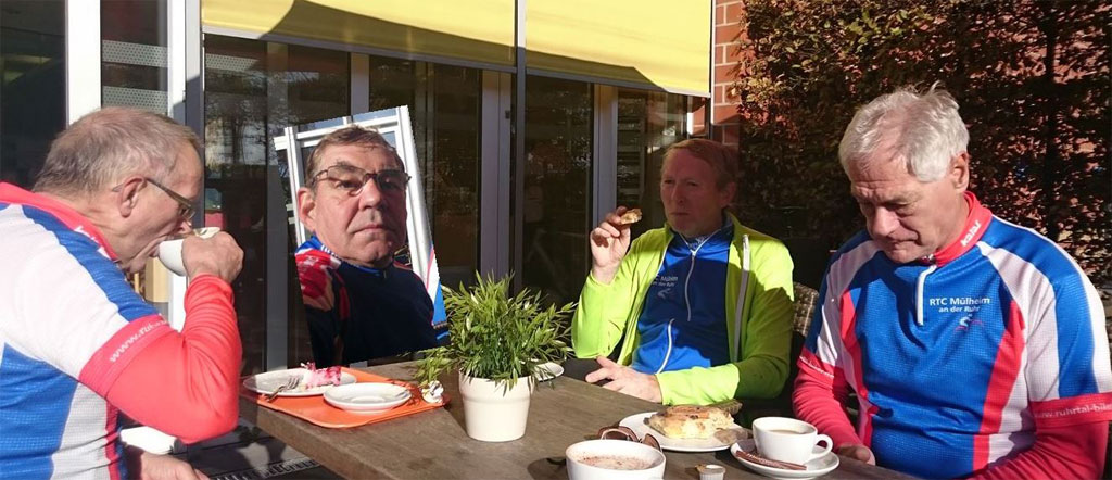Manfred (der Chef) war vor Ort und wir gingen gemeinsam auf die 40-er Runde. Manfred war noch geschafft vom Urlaub und ich vom gestrigen Training. Also genossen wir die inzwischen warme Sonne und absolvierten eine lockere Runde. Meine Begleiter, die ab Mülheim gestartet waren, erfreuten sich derweil am Kuchenbuffet vor Ort, das viele Leckereien bot. Wir überprüften das Angebot nach der Runde und trafen noch einige Mitstreiter wieder.