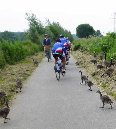 Auf der Rückfahrt nach Mülheim über den Rheinpfad nach Wittlaer löste sich die Gruppe nach und nach auf, weil Jo und Wolfgang über den Rhein nach Hause fuhren, Bernd und Harry ihre Rennradvorteile ausspielten und Udos Weg nach Alstaden führte. Nach 58 Kilometern, 3 Stunden Fahrzeit und einer Durchschnittsgeschwindigkeit von gut 19 Stundenkilometern fand die Runde am Saarner Storch sein Ende.