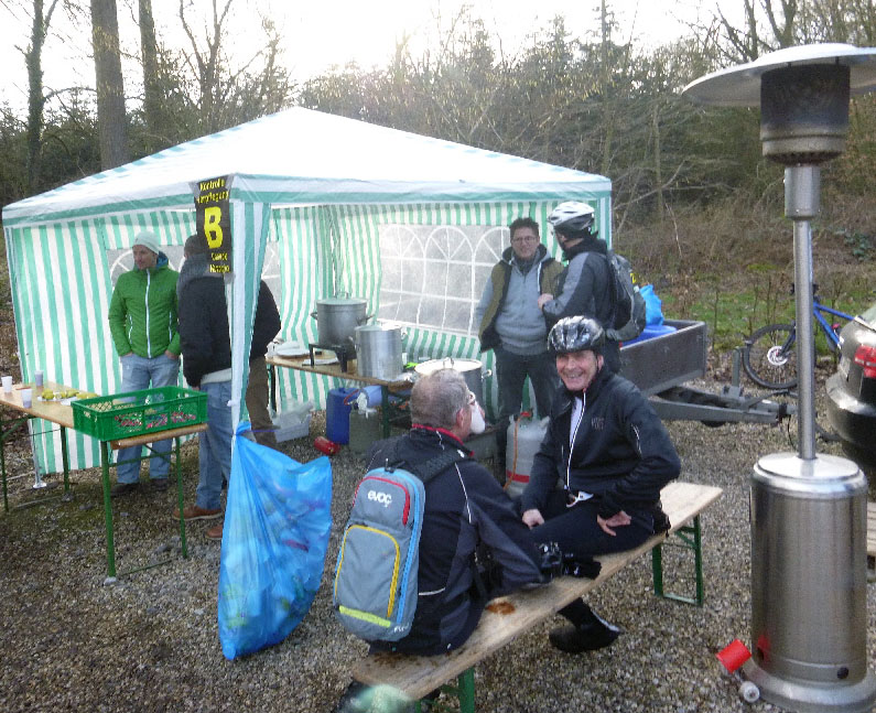 Marius, der sich am Start zu uns gesellte, Thomas und Klaus erweiterten den Ausflug um die kleine Runde, die den Rhein überquert und im großen Bogen Neusser Flachland bietet. Zu erwähnen ist, dass die Kontrolle kulinarische Leckerbissen bot, die selten geboten werden: Zwiebelkuchen und Pastete mit einer Frischkäse-Kräuterfüllung waren sehr lecker.