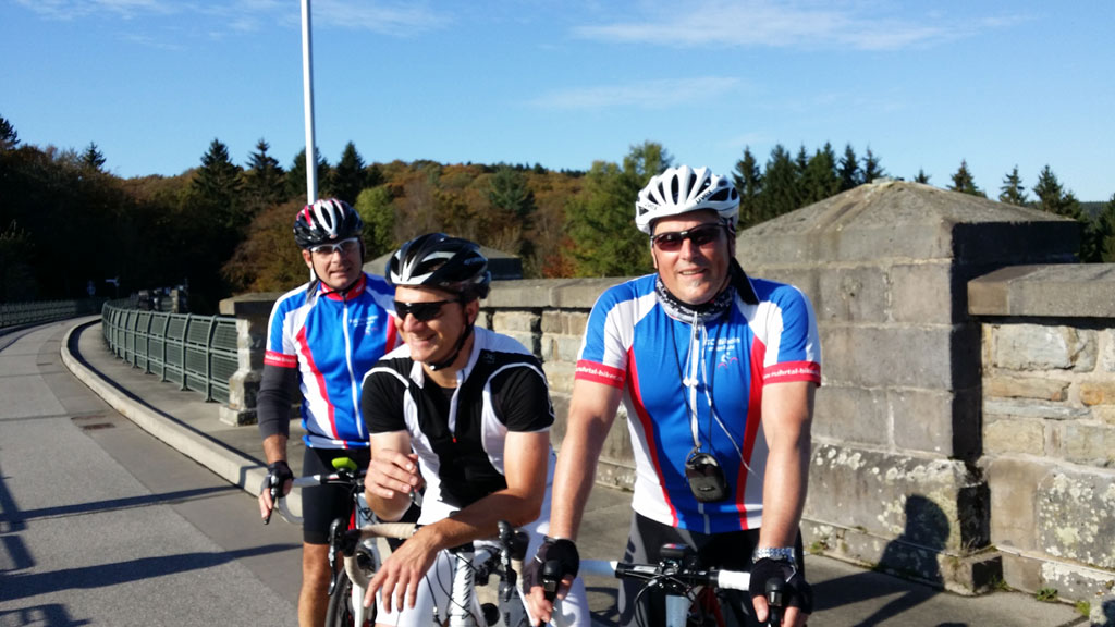 Bis dahin hatten wir uns bei sonnigem, aber recht kühlem Wetter auf das wellige Profil eingestellt. Über Odenthal, vorbei an der Dhünn-Talsperre hinauf nach Hückeswagen folgten wir schönen, relativ verkehrsarmen Straßen. Bei Marienheide erreichten wir die höchste Höhe und der Anstieg war giftig.