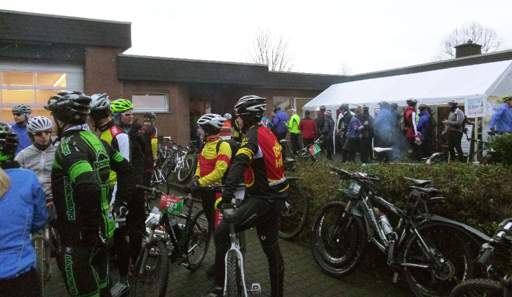 Zu Beginn der Winter-Bike-Trophy ist Geduld eine nützliche Eigenschaft um auf die Strecke zu gelangen. Knapp 1.000 Biker waren heute in Capelle am Start. Startplatz und bauliche Rahmenbedingungen sind leicht überfordert bei diesem Ansturm. Die Teilnehmer bilden lange Schlangen um sich am Start anzumelden und die Online-Anmelder müssen zudem die Startunterlagen für die Trophy in Empfang nehmen, um sich dann ebenfalls anzumelden. Die kreative Idee in diesem Jahr bestand darin, den Online-Anmeldern die Startunterlagen bereits vorab über die Vereine auf dem Postweg zukommen zu lassen. Immerhin wäre der Aufwand am Ausgabezelt für die Startunterlagen deutlich kleiner geworden.