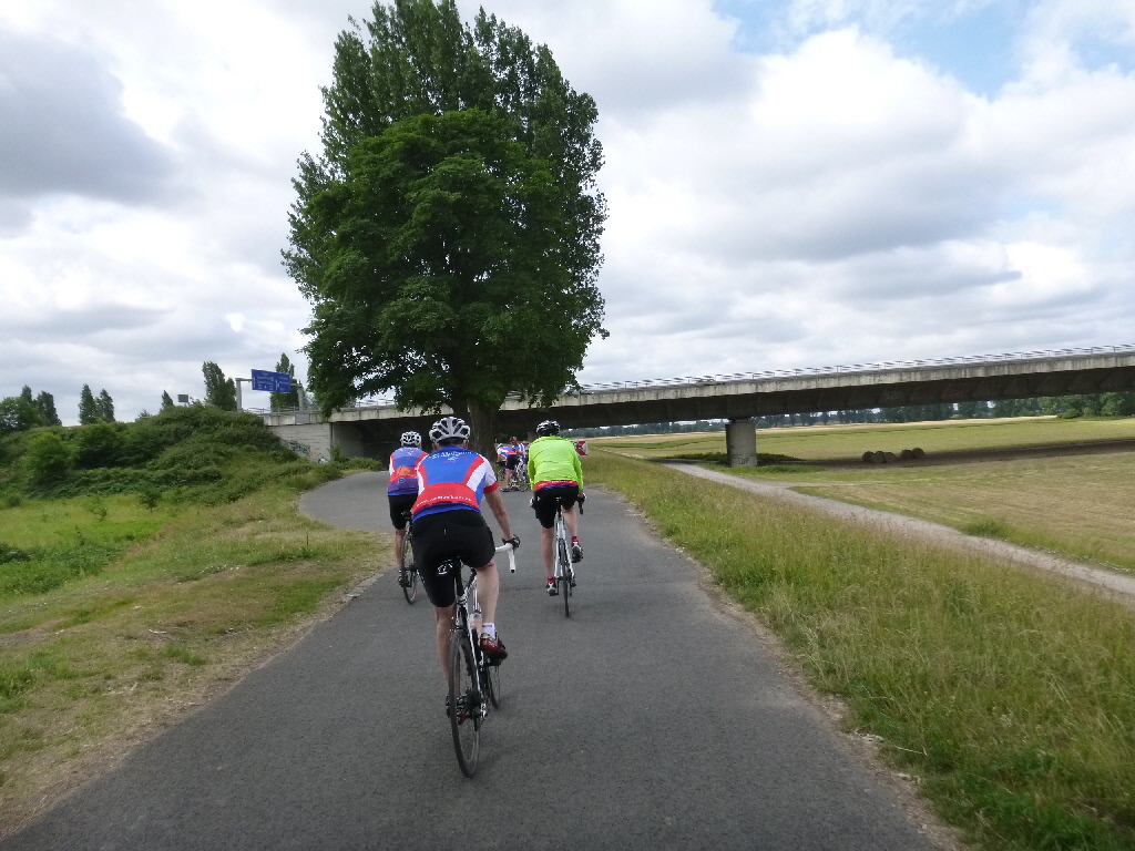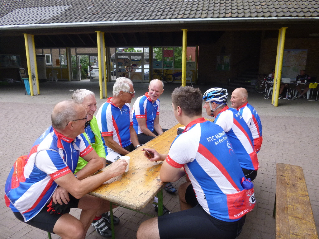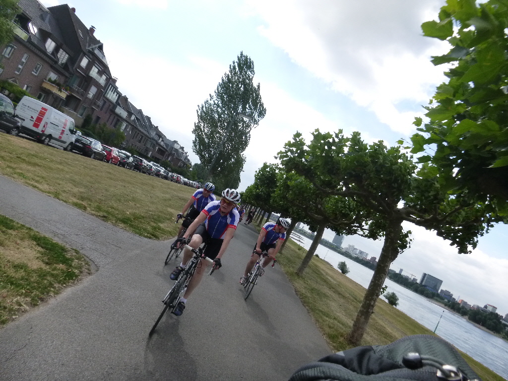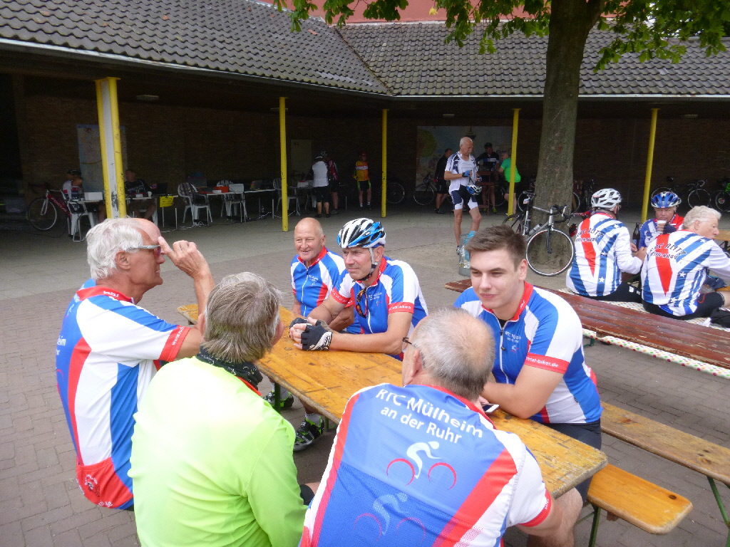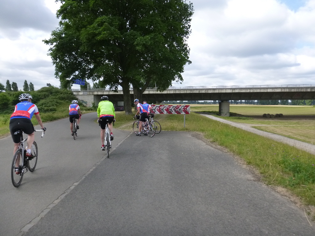 Sieben Radsportler waren am Treffpunkt und wir sammelten unterwegs noch zwei Duisburger Kollegen ein. Da ein Teil unserer Vielfahrer in anderen Gefilden im Urlaub weilte, war das eine erfreuliche Beteiligung. Bis zur Rheinbrücke führte Thomas die Gruppe an, dann übernahm Klaus T. das Kommando. Da in D-Dorf eine große Triathlon Veranstaltung unseren Weg blockierte, hatte Klaus einen Alternativplan auf dem Garmin. Sein Plan führte auf der Neusser Seite auf neuen Wegen nach D-Dorf Flehe zum Startpunkt. Unterwegs verloren wir Bernd und Friedel, die dann aber noch vor uns am Ziel waren. Als Kilometersparfreak hatte Friedel wohl noch eine schnelle Alternativroute im Köcher. Nach Anmeldungs- und Kaffee-Ritual ging es schnell wieder los. Wolfgang wechselte noch einen Schlauch am Vorderrad in einer sehr dunklen Ecke – siehe da: er kann es auch blind. Dann ging es auf Friedels Spezialstrecke zurück. Am Ende hatten wir dann 95 km bei angenehmen Temperaturen auf der Uhr. TT