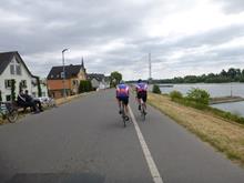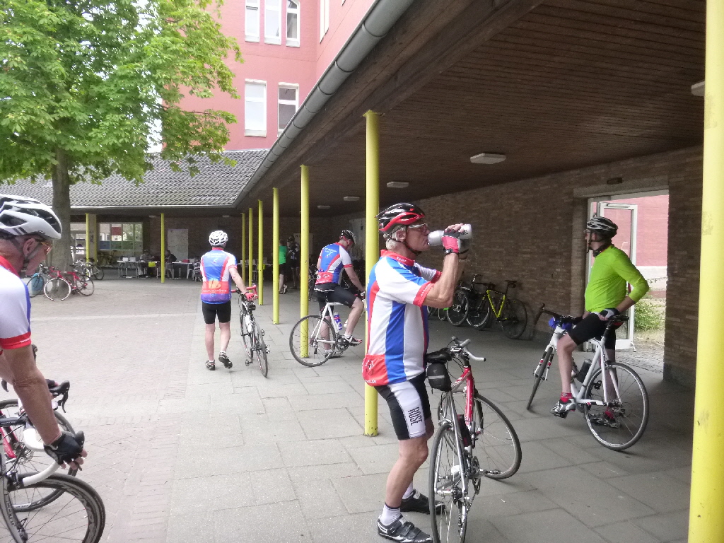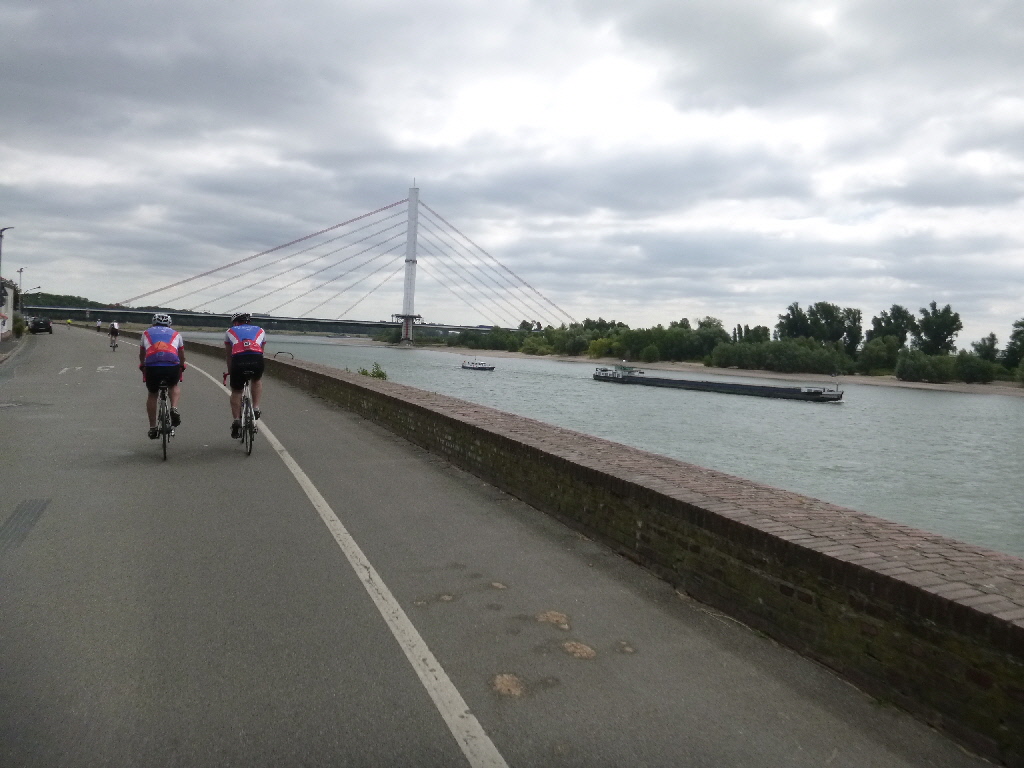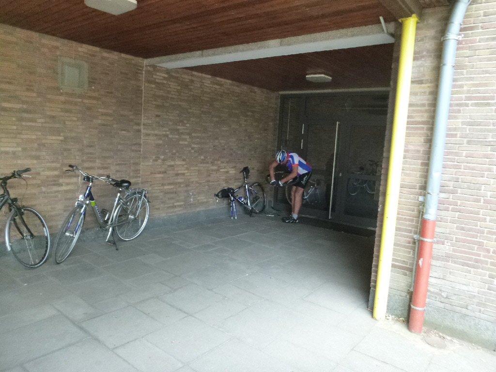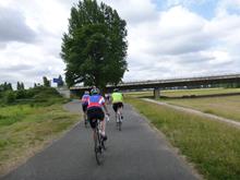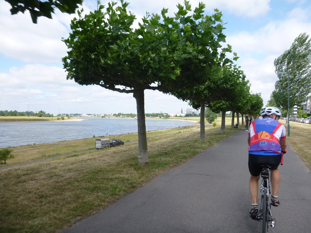 Sieben Radsportler waren am Treffpunkt und wir sammelten unterwegs noch zwei Duisburger Kollegen ein. Da ein Teil unserer Vielfahrer in anderen Gefilden im Urlaub weilte, war das eine erfreuliche Beteiligung. Bis zur Rheinbrücke führte Thomas die Gruppe an, dann übernahm Klaus T. das Kommando. Da in D-Dorf eine große Triathlon Veranstaltung unseren Weg blockierte, hatte Klaus einen Alternativplan auf dem Garmin. Sein Plan führte auf der Neusser Seite auf neuen Wegen nach D-Dorf Flehe zum Startpunkt. Unterwegs verloren wir Bernd und Friedel, die dann aber noch vor uns am Ziel waren. Als Kilometersparfreak hatte Friedel wohl noch eine schnelle Alternativroute im Köcher. Nach Anmeldungs- und Kaffee-Ritual ging es schnell wieder los. Wolfgang wechselte noch einen Schlauch am Vorderrad in einer sehr dunklen Ecke – siehe da: er kann es auch blind. Dann ging es auf Friedels Spezialstrecke zurück. Am Ende hatten wir dann 95 km bei angenehmen Temperaturen auf der Uhr. TT