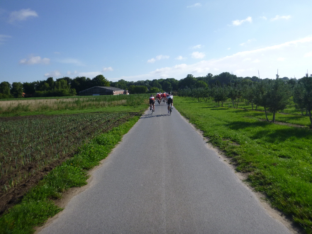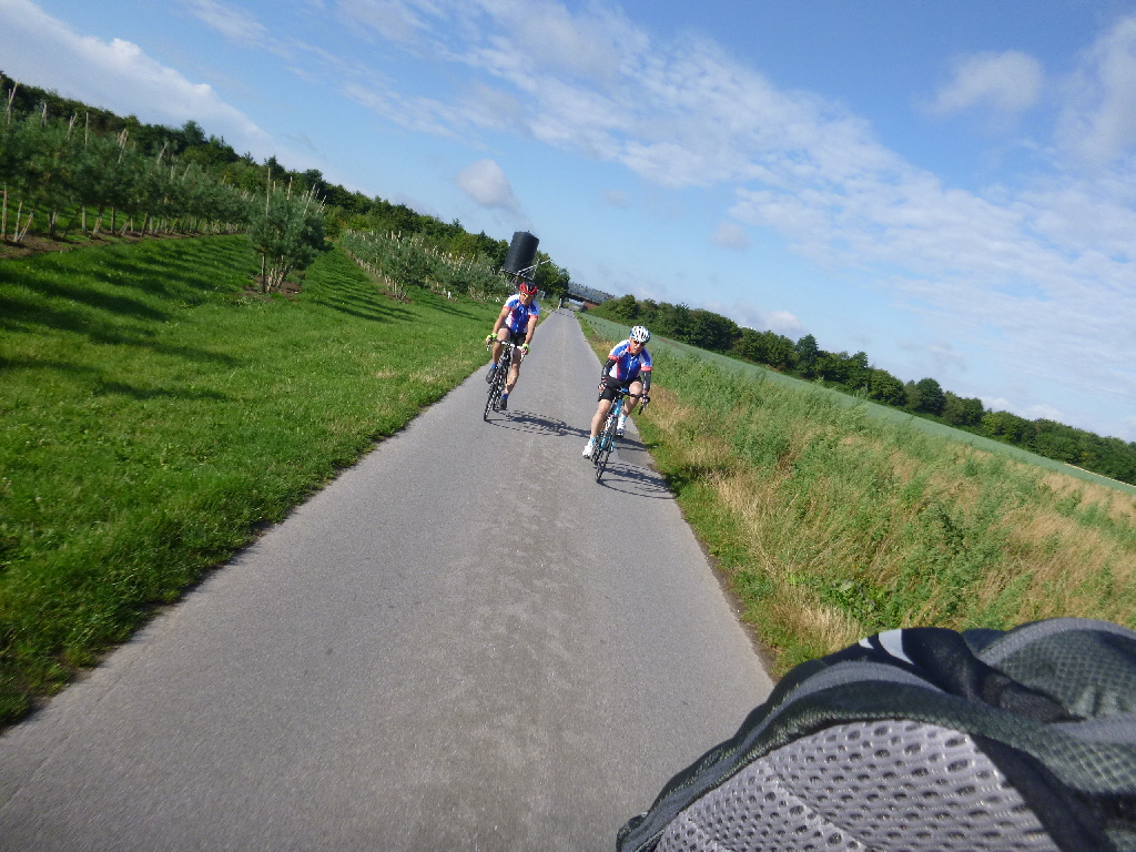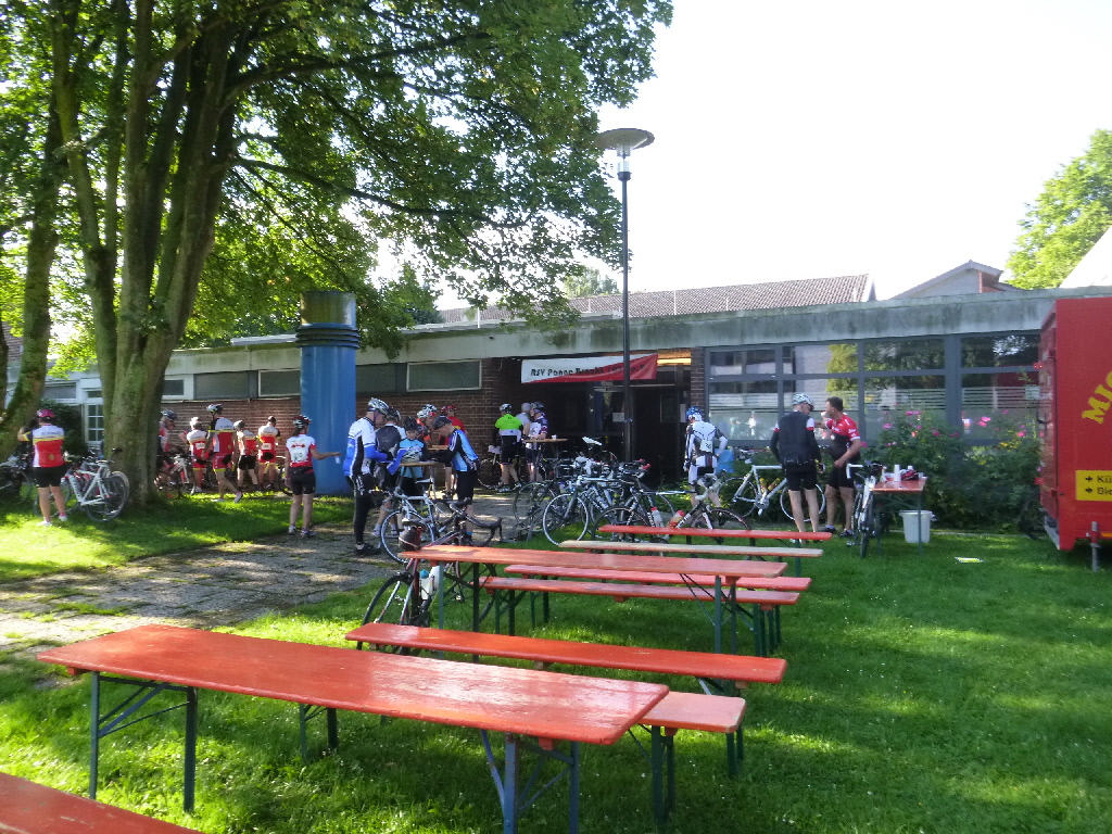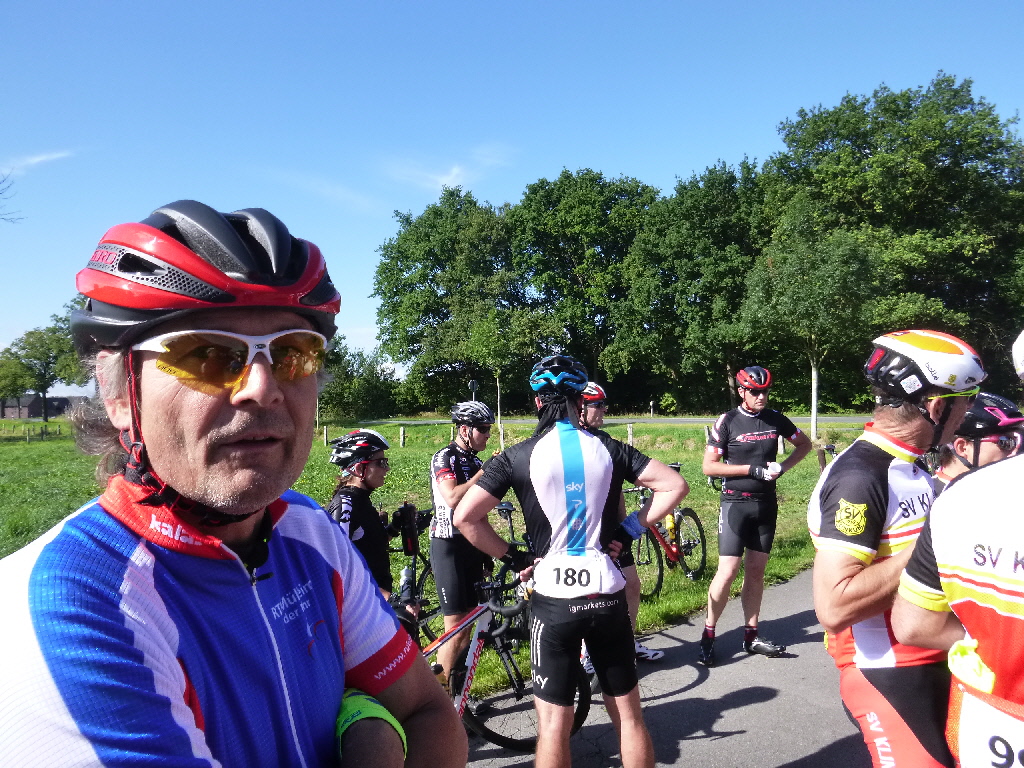 Kurz entschlossen hatten wir den freien Sonntag mit einer Runde vor Ort in Brüggen-Bracht gefüllt. Kai-Uwe sammelte noch ein paar Zeiten für das Radsportabzeichen, Brigitte hatte das Straßenrad entstaubt und schnupperte angenehme, nicht zu warme RTF-Luft im Nettetal und Thomas und ich waren auch mal wieder in Sachen Punkte (ohne scan&bike) unterwegs. Die Sporthalle in Bracht bietet jede Menge Platz und die drei Anmeldetische wirkten fast verloren im großen Saal. Panne Bracht hatte die Durchführung der RTF nur mit Mühe und viel nachbarschaftlicher Hilfe gestemmt und wurde mit rund 300 Teilnehmern belohnt. Auf der Strecke war noch einiges los. Zu Beginn folgten wir dem großen Pulk aus Klinkum, aber irgendwann wurde uns die systematische und großräumige Umrundung der Pfützen zu bunt. Wir gaben den freundlichen Windschatten auf und fanden sogar schnell flottere Hinterräder, die gleichmäßiger über die schöne Strecke fegten. Mein deutlicher Trainingsrückstand machte mir bisweilen zu schaffen, aber bis Kilometer 40 blieb ein Schnitt von 29 km/h auf der Uhr, der dann bis ins 70 km Ziel auf 27,5 schrumpfte. Kai-Uwe hatte die flotten Hinterräder im Auge behalten und blieb dran. Er nahm uns knapp 10 Minuten ab und wollte sein Ergebnis ins Fahrtenbuch fürs Radsportabzeichen übernehmen. Das Wetter hielt gut und im Ziel hatte Brigitte nach Abschluss der 40-er Runde nicht lange auf uns warten müssen. Kaffee, Kuchen und Würstchen in der Gartenwirtschaft des Panne-Bracht-Vereins schmeckten als Kalorienersatz gut. Trotz der 100 Auto-Kilometer An- und Abfahrt waren wir recht früh wieder daheim, denn Sonntags ist die A40 natürlich nicht leer aber zügig fahrbar. km