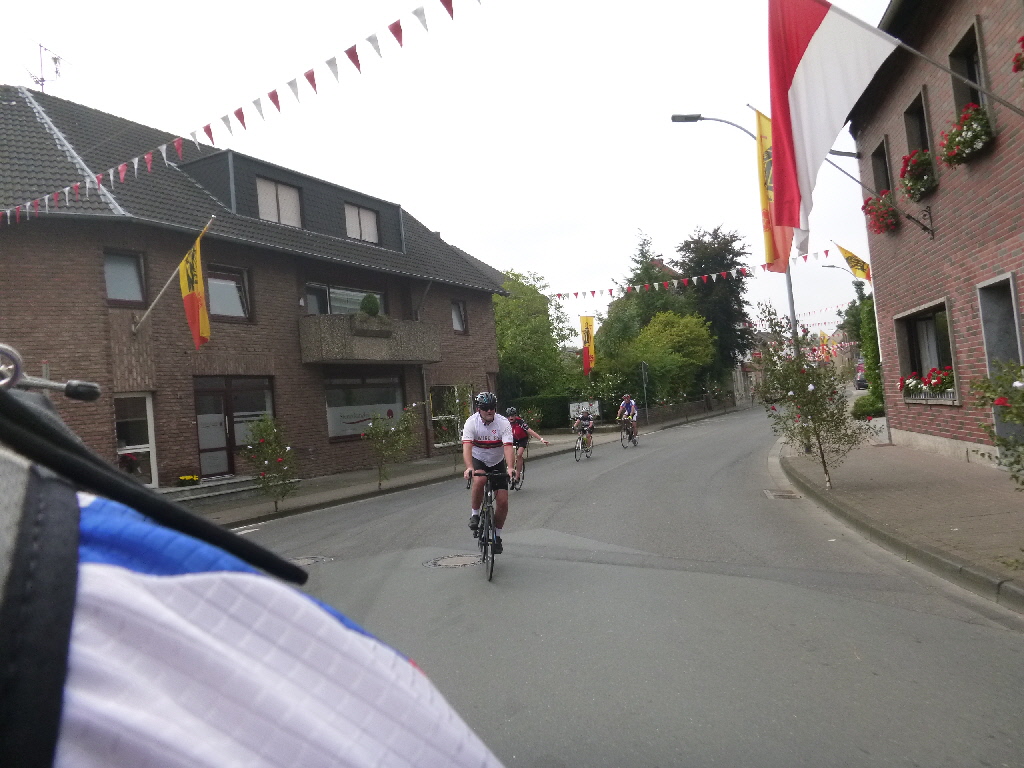 Kai-Uwe hatte Kai und Frau mitgebracht. Da die Gruppe nicht ganz homogen war, trennten wir uns nach ein paar Kilometern. Wolfgang war mit dem Treckingrad angetreten und wollte das Tempo trotz bester Fitness nicht mitgehen, fuhr also etwas moderater allein weiter. Die Gruppe fuhr flott von Kontrolle zu Kontrolle. Im Ziel wies der Tacho einen beachtlichen 29-er Schnitt aus. Die Bratwurst-Belohnung und ein alkoholfreies Pils schmeckten. Kaum war alles verzehrt kam auch Wolfgang ins Ziel und hatte mit rund 2 Stundenkilometer weniger auch ein „Goldenes“ Ergebnis eingefahren. Wir saßen zur Auswertung noch eine Weile beisammen, die Moerser hatten mit rund 570 Teilnehmern ebenfalls wieder ein gutes Ergebnis erreicht und alle waren zufrieden. Nächste Woche nehmen die Freunde des DRA dann die 70-er Runde in Oberhausen unter die Räder und wir werden wieder „Gas“ geben. TT