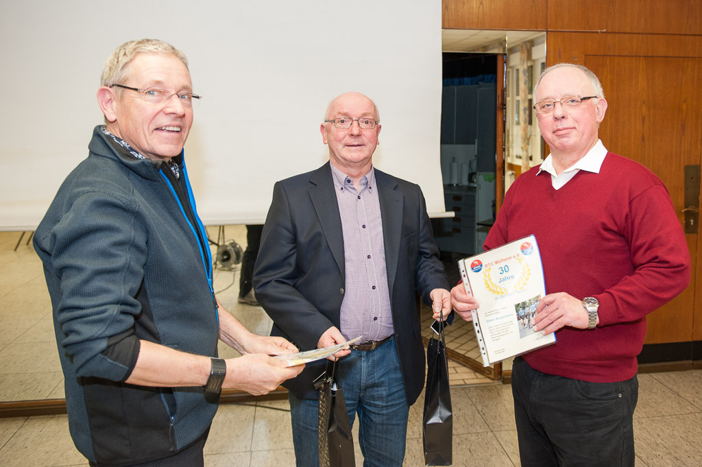 Christian Levesque war Gast auf der JHV des RTC Mülheim und informierte zum Stand der Vorbereitungen zum Grand Depart am 1./2. Juli 2017 in Düsseldorf. Als Ratinger ist er im Organisationsstab für den 7,5 km langen Abschnitt der 2. Tour-Etappe durch Ratingen. Einiges ist noch nicht abschließend geklärt zum Tour-Start und wir Mülheimer nahmen zur Kenntnis, dass auch durchaus noch Helfer gesucht werden. Die JHV war recht gut besucht und im Vereinsheim Wenderfeld des TV Einigkeit berichtete der Vorstand über das vergangene Jahr, das bei abnehmender Aktivität immer noch recht erfolgreich verlaufen ist. 2 Jubilare wurden geehrt, Dieter Kappenberg ist seit 30 Jahren dabei und Gerd Hünnemann feiert das 25. Mitgliedsjahr. Mit Sekt und Urkunde wurden beide gewürdigt und zur Weiterfahrt animiert. Größeren Raum nahm die Diskussion zur Gestaltung der Radsportsaison 2017 ein. Die großen Pflöcke sind ja gesetzt: Mit Karfreitagsausflug, TDF-Start, Zeitfahren, RTF, Mittwochsrunden und 3 Etappenfahrten, stehen die Schwerpunkte fest, deshalb entspann sich die Diskussion um die Gestaltung der Aktionen zwischen den Höhepunkten. Das leidige Punktethema bei den Sternfahrten auf denen entweder ungerechtfertigt Punkte erschlichen werden oder bei strenger Auslegung wacker erfahrene Kilometer nicht gewertet werden, führte zu dem Ergebnis, dass im Verein in 2017 die Zahl der Teilnahmen an den Veranstaltungen gewertet wird und nicht die Zahl der erreichten Punkte. Im Vordergrund soll die Freude an den gemeinsamen Radrunden stehen und nicht der Sieg nach Punkten. Der Vorstand ist beauftragt, den genauen Modus auszuformulieren. Terminlich wird es einen Plan geben, der pro Monat eine Reihe Vorschläge zu gemeinsamen Sternfahrten vorgibt und es wird eine Vorschlagsliste geben, die Ziele vorgibt, die jeder freiwillig zur gemeinsamen Ausfahrt nutzen kann. Nach rund 3 Stunden war der große Themenkatalog abgearbeitet und der RTC geht in die Umsetzung – es bleibt viel zu tun.