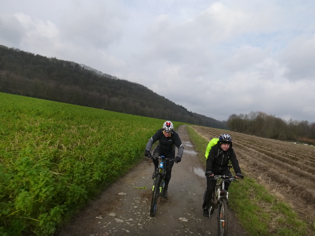 Die Wittener Strecke hat zu Beginn einige Bergauf- und Waldpassagen und da Thomas sichtlich bemüht war, ließen wir Marius ziehen und fuhren moderater über die Runde. Die Räder gewannen deutlich an Gewicht und glichen sich farblich dem Waldboden an. Eigentlich war die Langstrecke auf dem Programm, aber wir einigten uns auf die kürzere 46 km Runde, was aber der Tour etwas den Pfiff nahm, denn in der 10 km Schleife liegen schöne Trails und wir vermissten die Fahrt durchs Muttental mit den Bergbau-Erinnerungen.