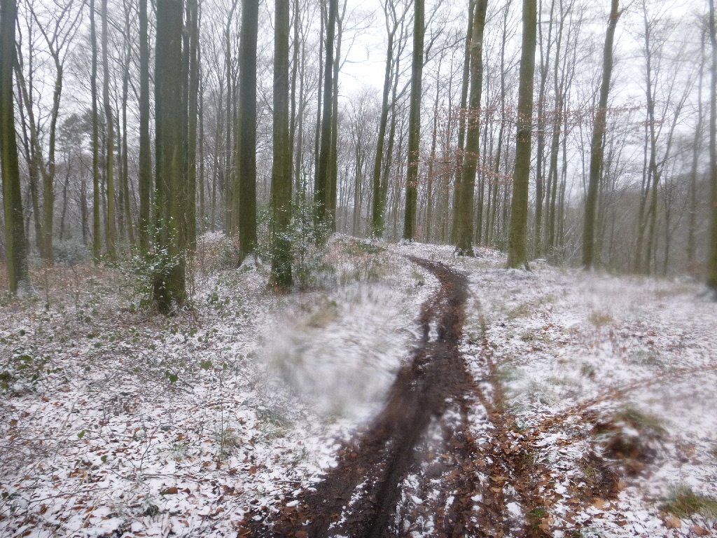 Witten liegt in passabler Nähe, also Auto packen und dann via A40 mit geringem Verkehr nach Osten. Vor Ort in Witten wurde die Wettervorhersage eingelöst und es schneite in kleinen lockeren Flocken. Wir starteten gemeinsam und die leicht verschneite Landschaft war nett anzusehen. Auf Trails und Wegen hatte das aber den Effekt, dass das Geläuf schmierig und bisweilen recht tief und schwer wurde.