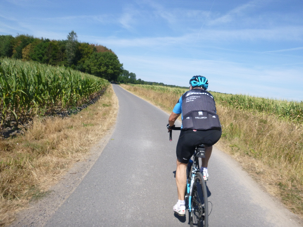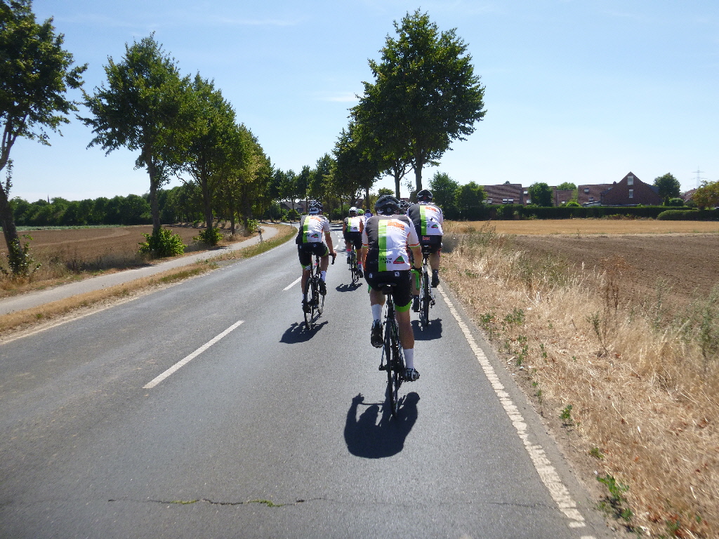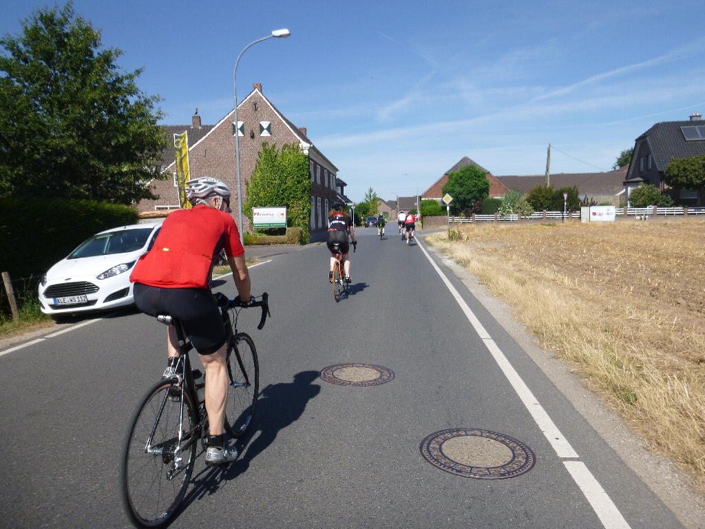 Ich war traditionell etwas spät dran, am RTC Treff wartete Thomas und die anderen waren schon mal losgefahren. Bis zur Duisburger Metro hatten wir die kleine Gruppe eingeholt, der sich heute Rainer D. vom Krayer Club angeschlossen hatte. Vor Ort in Huels war ein kleines Picknick angesagt, wichtig waren die Getränke, denn das Wetter nötigt zu viel Nachschub. Thomas und ich gingen auf die kleine Runde bei den Huelsern, die aber eigentlich 1,5 Punkte wert war, denn erst nach 58 Kilometern waren wir wieder am Startort. Bei dem Wetter nicht gerade die schönste Überraschung für die Teilnehmer und auch für Thomas, der gegen Ende erstaunlich abbaute. Nach der Pause und dem Klön vor Ort rollten wir locker, Thomas etwas mühsamer nach Hause. Rund 120 flache Kilometer waren angesichts der Wärme ein ordentliches Stück Arbeit. km |