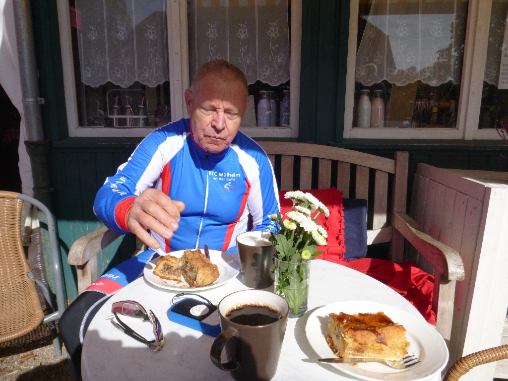 Am Mittwoch sammelten Kai-Uwe, Andreas und Thomas Trainingskilometer im schönen Abendsonnenschein. Auch wenn es deutlich kühler geworden war, machte die Gewöhnung an herbstliche Temperaturen Spaß. Für Thomas waren es Kilometer in Vorbereitung des Münsterland-Giros am folgenden Mittwoch. Der Samstag diente eher der Regeneration und Thomas und Klaus tingelten zwischen Aschlöksken, Kaiserswerth und Schloß Heltorf. Auch am Samstag meinte es das Wetter gut mit den Radfahrern. Am Sonntag war Thomas dienstlich unterwegs und durfte an der Kettwiger Anmeldung Punkte an RTF-Fahrer verteilen. Vielleicht hatte die lausige Kälte einige interessierte Streiter abgehalten, aber mit 708 Teilnehmern konnten die Kettwiger ein gutes Ergebnis verkünden. Brigitte und Klaus nutzten die Gelegenheit gemeinsam Höhenmeter zu sammeln. Die Kettwiger sind mit Höhenmetern sehr großzügig und schon mit der 40 km Runde waren 660 Hm eine anspruchsvolle Aufgabe. Die Streckenführung war dabei wirklich toll. Weitgehend auf Nebenwegen ließ sich die Landschaft im Süden Essens genießen, sofern die Aufmerksamkeit nicht zu sehr auf die Straße gerichtet war. Während Thomas arbeitsam Schreibarbeit verrichtete, konnten Brigitte und Klaus im Sonnenschein am Mittag ausführlich Kaffee trinken. Bis zum Mittwoch blieben noch 3 Tage bis zum Giro und die Hoffnung auf schönes Wetter scheint Realität zu werden. |