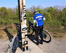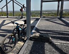 Die Verabredung zur CTF-Runde in Krefeld verursachte die Nutzung des Autos und des immer noch ziemlich neuen Thule-Trägers. Das hatte dann unangenehme Folgen mit einem überschaubaren Unfall. Die Radbefestigung für ein modernes ebike ist nur sehr mittelmäßig gelöst, weil der Befestigungsrahmen nicht hoch genug ist und daher keine Fixierung am Oberrohr zulässt. Das Unterrohr am Rad ist wegen des Akkus sehr volumig und der Greifarm findet zwar Halt, aber von umschließen kann nicht die Rede sein. Beim Unfall kam hinzu, dass wegen des Flaschenhalters der Greifarm von außen fixiert werden musste und die Befestigung der Hinterrades nur sehr knapp griff, weil das Rad nicht mittig zu fixieren war. Der Effekt war übel, denn die Befestigung am Hinterrad löste sich während der Fahrt und das Rad hing an der Autobahnauffahrt nur noch an der Vorderradaufhängung. Um anzuhalten musste ich erst durch die Baustelle, weil ich sonst die Autobahn dicht gemacht hätte. Glück im Unglück war, dass das Rad nur mit dem Sattel Bodenkontakt bekam. Der SQLab-Sattel ist zwar hin, aber das blieb der einzige Schaden. Flaschenhalter abmontieren, mittiger ausrichten, alles wieder fixieren und dann konnte die Fahrt nach Moers fortgesetzt werden. Auch wenn am Träger vieles wirklich gut gelöst ist, bleibt der Ärger über den tiefstehenden Rahmen zur Radbefestigung. Das fehlende Stück am Sattel machte sich nicht negativ bemerkbar. Bei sommerlichen Temperaturen gingen wir auf die Runde und kletterten über 3 Halden – Norddeutschland, Pattberg und Rheinpreussen und genossen jeweils niederrheinische Aussicht. Am Geleucht auf Rheinpreussen trafen wir auf 2 Radler, die Herbert unbedingt, aber vergeblich zu Vereinsmitgliedern machen wollte. Die Haldenwege enden am Waldsee, der trailige Wege bietet und der Rückweg folgt dem Moersbach auf schönen Pfaden. Auch ohne Eis- oder Bierpause war es eine attraktive Runde, die wir weiter empfehlen können. km