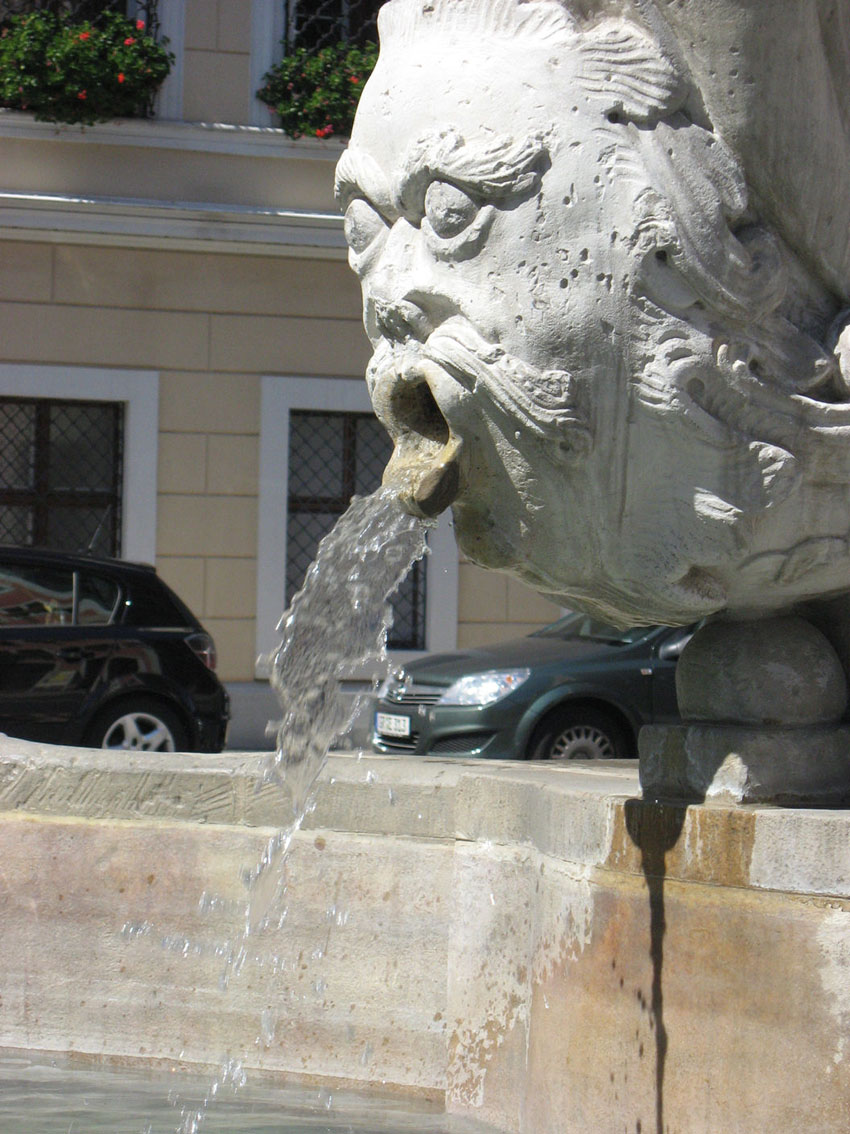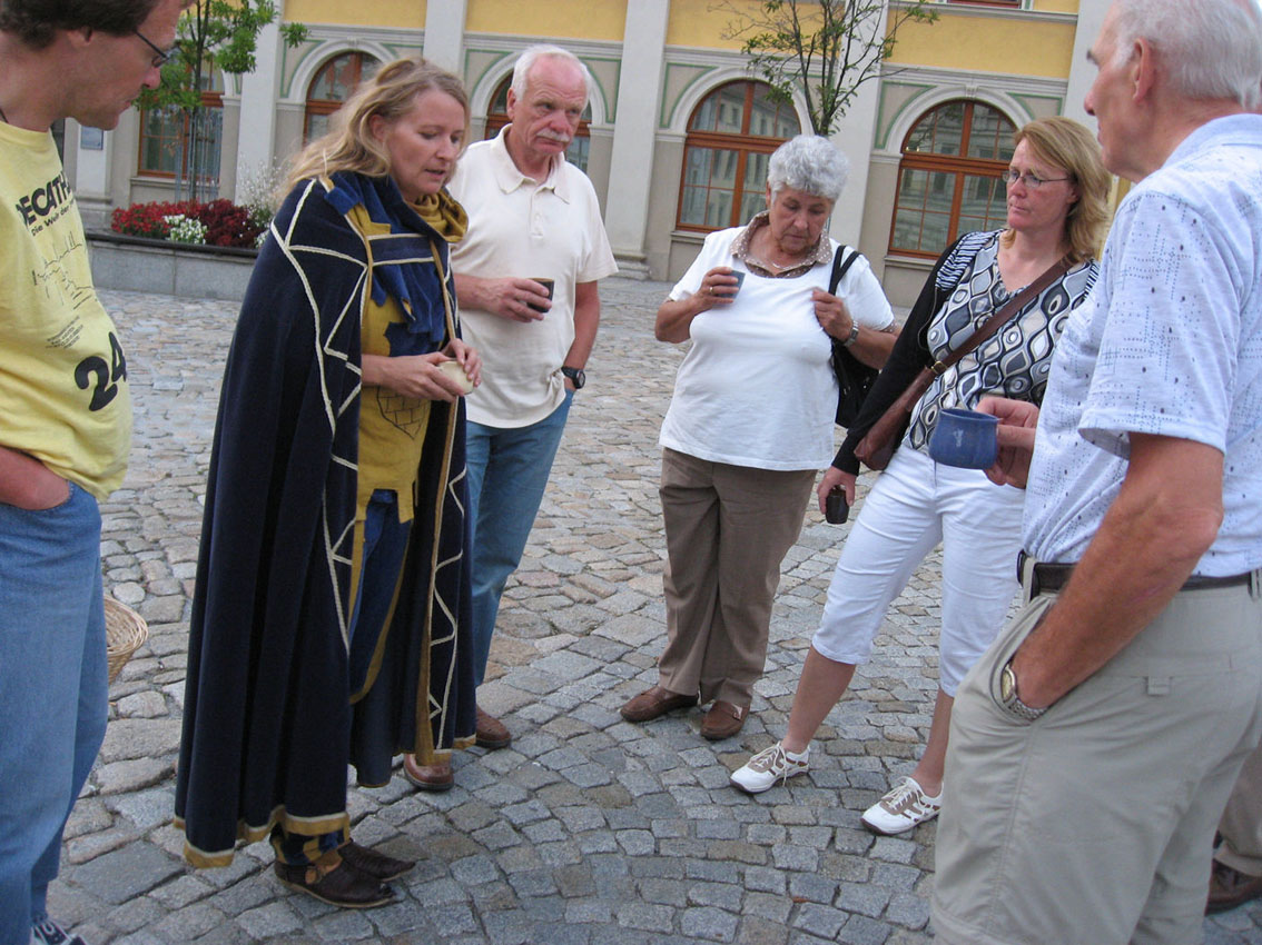 Das Abendprogramm startete im Karasek – traditionelle Gastronomie unter militärischer Bewachung durch den Soldaten Karasek. Gegen 19Uhr war dann die heitere Stadtbesichtigung angesagt, doch der Stadtführer schien uns vergessen zu haben. Den Handys sei Dank, trudelte er mit 1-stündiger Verspätung doch noch ein und stellte uns Stadt und Geschichte wortreich dar und versorgte uns mit „Rotem“ aus steinernen Kelchen. Er war eigentlich eine „sie“ –nach eigener Definition jedoch ein Knappe (immerhin ca. 750 Jahre alt) und also nicht von edlem Blut.