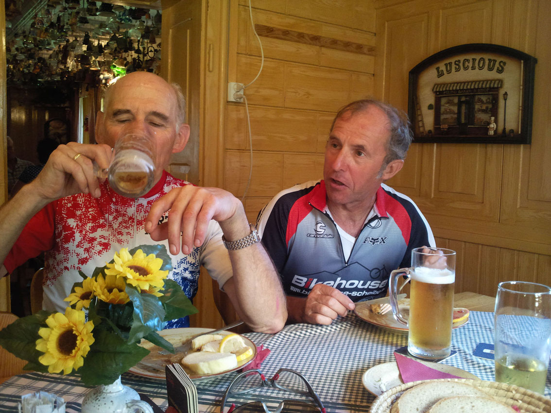 Natürlich wurde auch Rad gefahren. Wenn auch einige Handicaps hinderlich waren, Harry reiste mit schwerer Brustprellung und einem Oberarm, der täglich die Farbe wechselte an, weil er ein Rad bergab ohne Bremsen getestet hatte. Frank kämpfte gegen wandernde Nierensteine, Roberto litt unter Sitzbeschwerden (vielleicht weil die spartanische Ausstattung mit einer Radhose etwas knapp bemessen war) und Roberts Elan war bewundernswert, aber täglicher Einsatz auf dem Rad ging angesichts der geringen Kilometerzahl in 2009 über seine Kräfte.